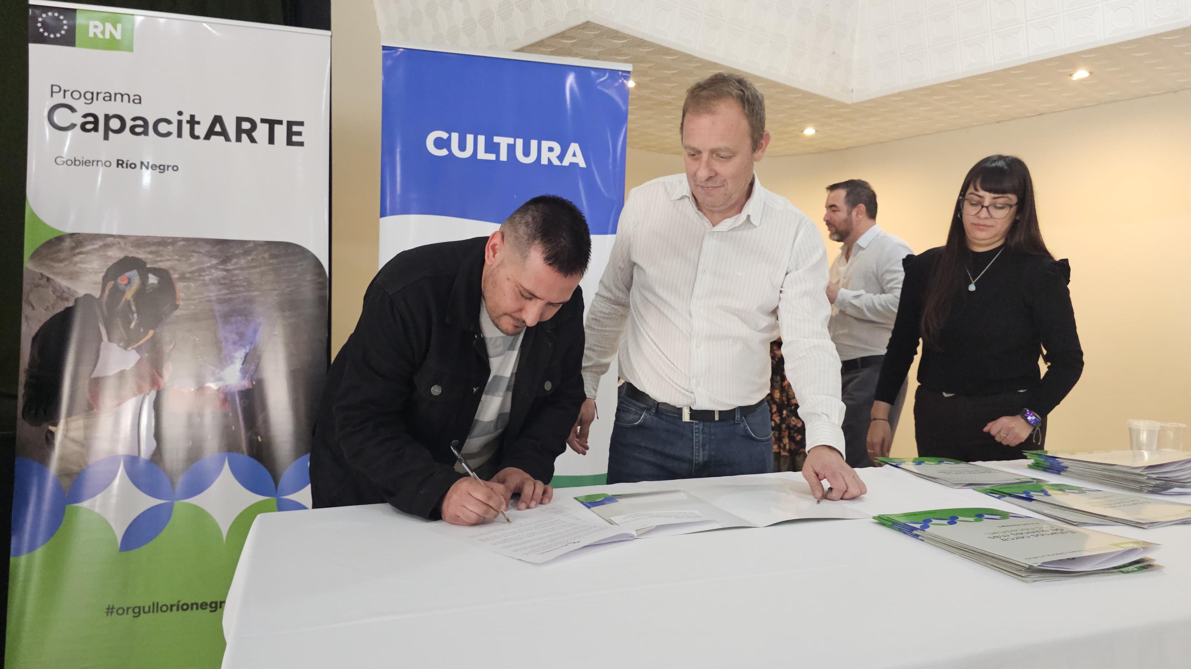 En General Roca, el Ministerio de Desarrollo Humano, Deporte y Cultura firmó convenios del programa Capacitarte, que permitirá la puesta en marcha de 73 talleres recreativos y de oficio en articulación con 23 instituciones de la ciudad.